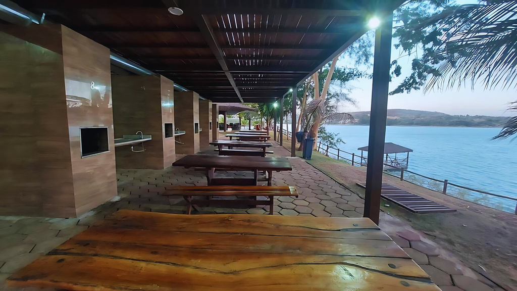 Quiosque, bar, área de churrasqueira com vista para o lago, píer e local para pesca.